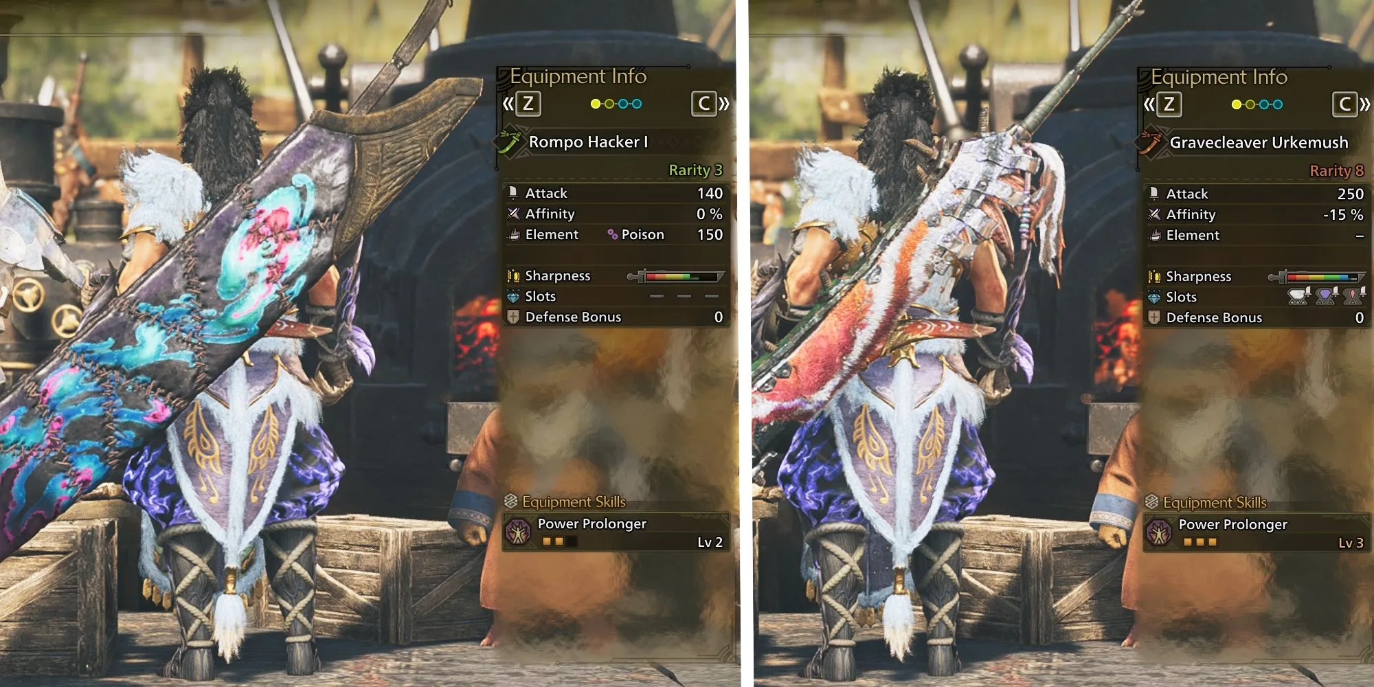Các loại Kiếm Dài ở Mức Thấp khá ổn để gây sát thương, nhưng trong hai lựa chọn được đề cập, chúng tôi khuyên dùng Rompo Hacker vì nó có kỹ năng Power Prolonger và sẽ gây thêm sát thương nhờ thuộc tính độc. Dosha Gravecleaver là một lựa chọn bổ sung tốt vì giúp bạn dễ dàng nâng cấp lên phiên bản Mức Cao của vũ khí này.